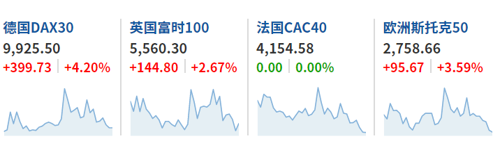 欧股普遍走高,英国富时100指数涨超2.5%,欧洲斯托克50指数涨3.54%,德国DAX指数涨3.87%。