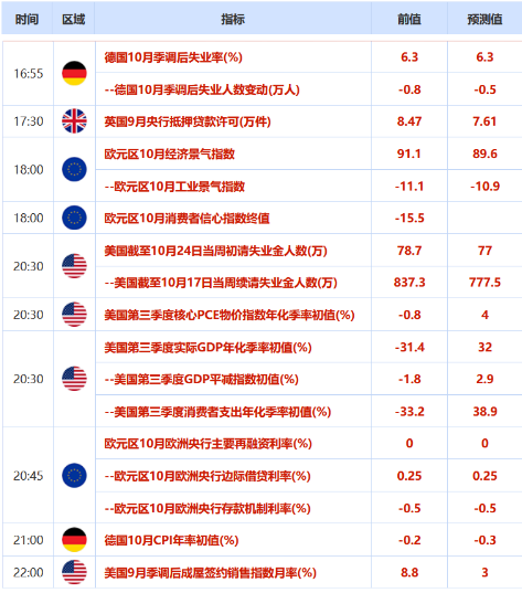 周四(10月29日)亚洲时段,日本央行决定维持政策不变,反映出随着生产和出口改善,日本经济从创纪录的收缩中持续出现复苏迹象,不过日本央行再次表示,如果需要,准备采取进一步行动。随着新冠感染人数再度激增,经济悲观情绪正在迅速蔓延,外界呼吁欧洲央行暗示向欧洲经济提供更大、更长期支持。这让即将于今晚21:30召开发布会的欧洲央行行长拉加德面临压力。美国大选结果出炉之前黄金多头料难有所起色,但下破1850依然需要较大的外力推动。