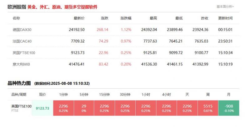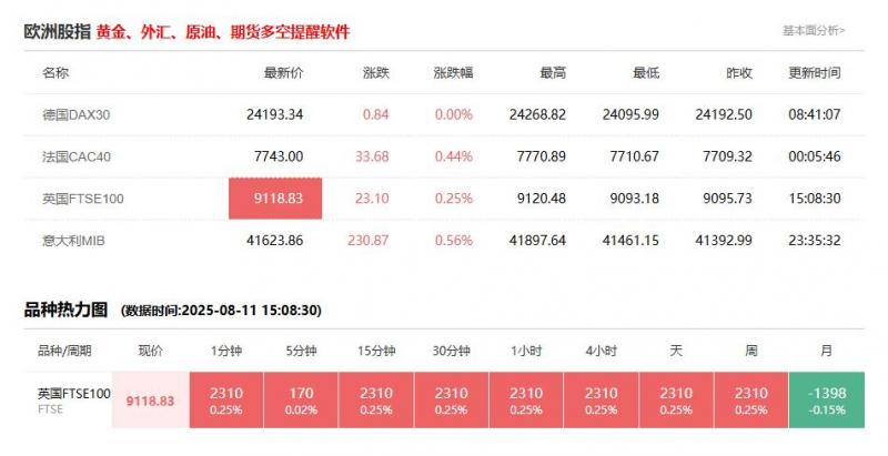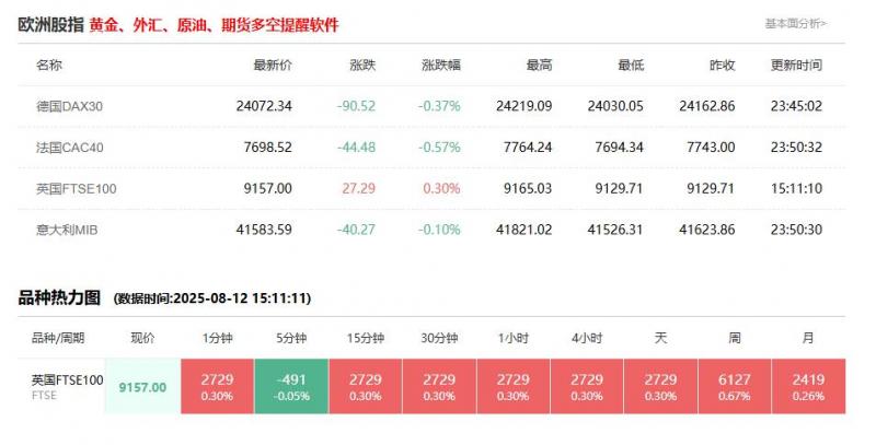 股市开盘: 德国DAX30指数8月12日(周二)开盘上涨70.88点,涨幅0.29%,报24143.22点; 英国富时100指数8月12日(周二)开盘上涨22.39点,涨幅0.25%,报9152.10点; 法国CAC40指数8月12日(周二)开盘上涨34.31点,涨幅0.45%,报7732.83点; 欧洲斯托克50指数8月12日(周二)开盘上
