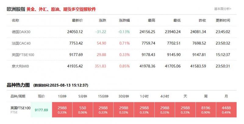 股市开盘: 德国DAX30指数8月13日(周三)开盘上涨96.40点,涨幅0.40%,报24146.52点; 英国富时100指数8月13日(周三)开盘上涨22.92点,涨幅0.25%,报9170.73点; 法国CAC40指数8月13日(周三)开盘上涨21.28点,涨幅0.27%,报7774.70点; 欧洲斯托克50指数8月13日(周三)开盘上涨21.98