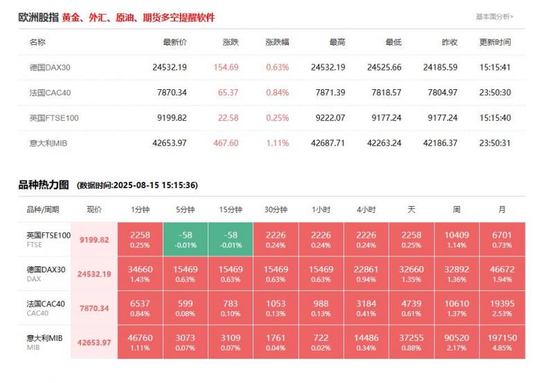 股市开盘: 德国DAX30指数8月15日(周五)开盘上涨157.65点,涨幅0.65%,报24524.47点; 英国富时100指数8月15日(周五)开盘上涨38.95点,跌幅0.42%,报9216.19点; 法国CAC40指数8月15日(周五)开盘上涨47.87点,涨幅0.61%,报7918.21点; 欧洲斯托克50指数8月15日(周五)开盘