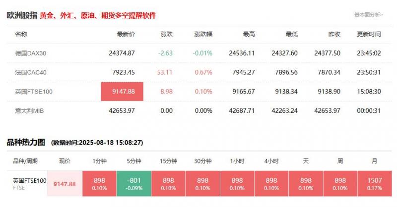 股市开盘: 德国DAX30指数8月18日(周一)开盘下跌40.37点,跌幅0.17%,报24334.50点; 英国富时100指数8月18日(周一)开盘上涨20.25点,涨幅0.22%,报9159.15点; 法国CAC40指数8月18日(周一)开盘上涨1.90点,涨幅0.02%,报7925.35点; 欧洲斯托克50指数8月18日(周一)开盘下