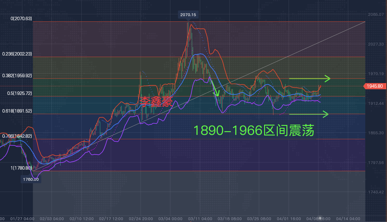 【黄金分析-美黄金】 黄金技术面分析:日线级别来看,上周先持续震荡,围绕在均线带上下运行,但并未突破20日线,导致震荡的主因是多空双方争夺造成的,而造成多空争夺的主因在于基本面多空的僵持,即市场对美联储加息预期对黄金带来阻力,而俄乌局势的不稳定又有一定的避险买盘需求,但双方又均没有明