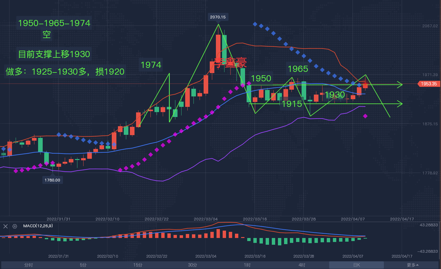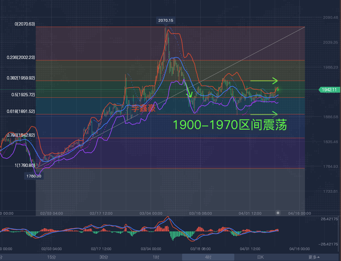 【黄金分析-美黄金】 下方1915区域的支撑已经测试多次,形成支撑过后,黄金多头也没有借力直接冲刺,那这样子下去,1915早应该要跌破了,黄金却偏不就不,每一次跌下去都感觉要大暴跌,突然拉升十几美元,看着要大涨上涨了,黄金偏不,又跌回来十几美元。 不按套路出牌的黄金,按它现在的