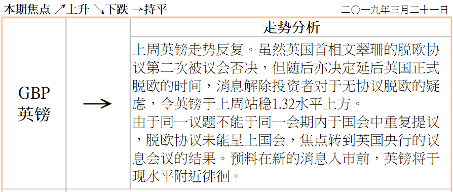 外匯評論 聯儲局偏鴿拖累美元下跌 市場對美聯儲的鴿派傾向感到意外,利淡美元普遍走軟。當局下調2019年和2020年經濟增長預測,其“點陣圖”現在亦顯示2019年內不會加息(相比之前的兩次加息),以及預計在2020年加息一次,量化緊浚≦uatitativTightig)亦將從5月開始放緩並於十月前結束。美聯儲的決定令美元