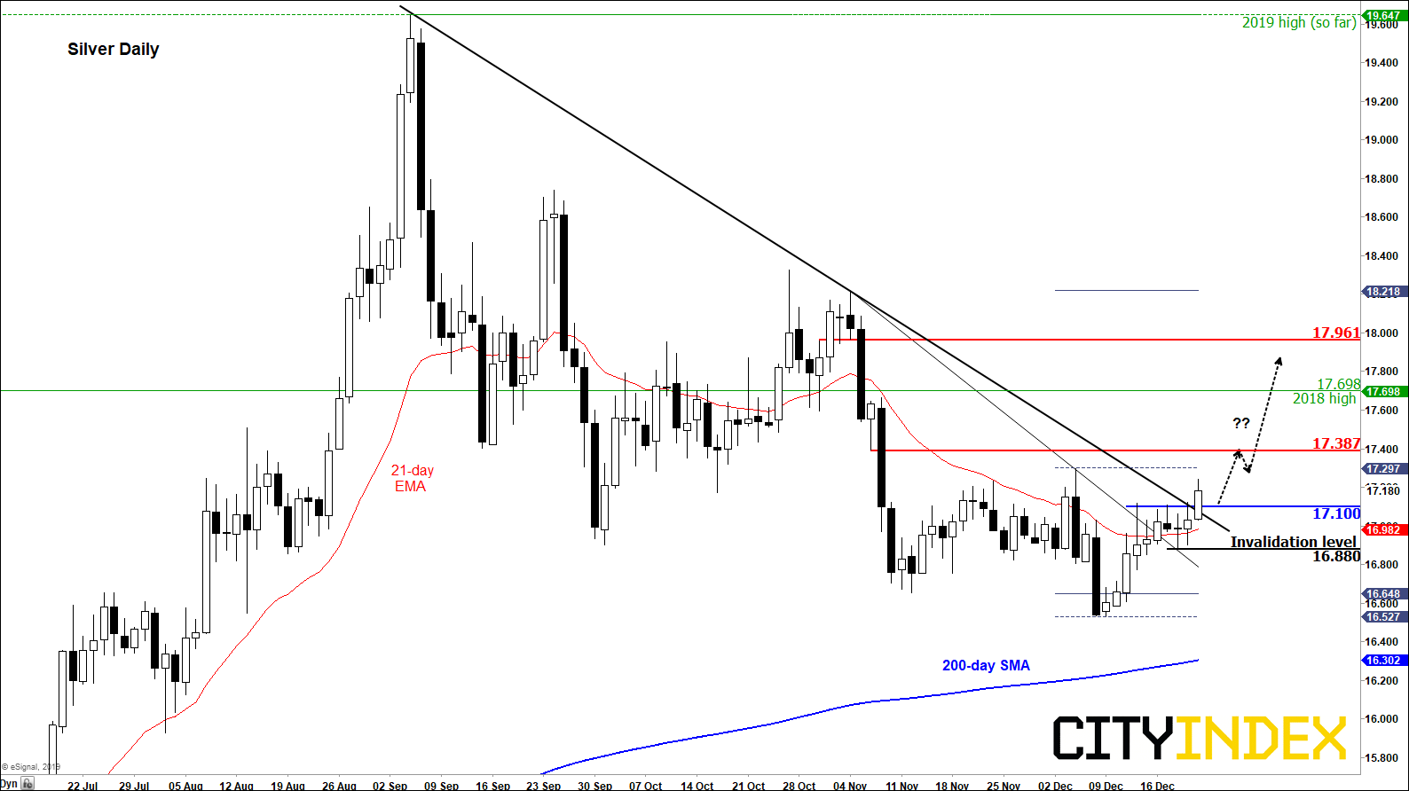 虽然上周五美股创下历史新高且美元指数扩大反弹,但贵金属依然坚挺,个中原因可能是在中国与美国达成阶段1贸易协议后对中国的贵金属需求增加的预期。事实上,在设法攻克17.10附近的关键阻力(途中击穿下跌趋势线)之后,白银的表现特别好。如果这次突破可以持续,可能在年底带来更多的后续技术买盘。白银的突破也暗示黄