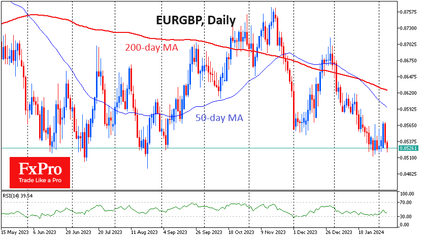 欧元兑英镑汇率回落至0.8520水平。该货币对去年6月和8月曾在此水平反弹。在1月底达到相同水平后引发了一轮抛售,但本周二和周三出现了积极的下跌,该货币对重新以增强的力度测试了数月来的低位。 Fxro高级分析师AlxKutikvich指出:从技术上讲,突破0.8500支撑位将使得0.8250-0.8300的走势成为可行。2.0-2.5%的下