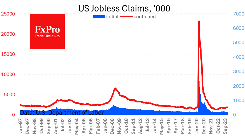 按历史标准衡量,美国每周首次申请失业救济人数仍处于低位,这是当前劳动力市场强劲的一个迹象。然而,尽管首次申请失业救济人数两年多来一直停留在22万左右,但持续申请失业救济人数正日益呈现上升趋势。 Fxro高级分析师AlxKutikvich指出:上周的数据为21.8万,低于22.7万,4周平均水平为21.225万。与此同时,1