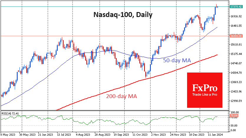 周一,美国指数创下历史收盘高点,道琼斯指数突破下一轮的38000,而前一日纳斯达克100指数突破17000,当日强劲上涨了2%。日本日经225指数日内反转下跌,接近37000——创34年新高。 Fxro高级分析师AlxKutikvich指出:一月份的短暂停歇后,自十月底以来,投资者对股市的贪婪一直持续。由于涨势已经持续了相当