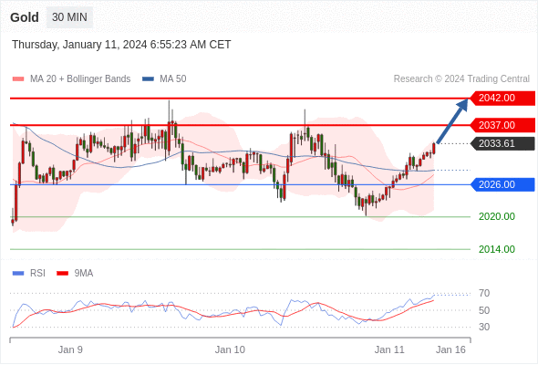 周五亚市早盘,金价从本周低点2,013美元反弹至2,030美元。不过,由于美联储(Fd)可能不会像预期的那样提前启动降息,这可能会对金价造成一定的抛售压力,因此黄金上行空间可能有限。 与此同时,美元指数上涨至102.30。美国国债收益率走高,10年期美债收益率为3.97%。 周四公布的美国通胀报告高于预期。美国12月
