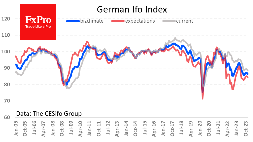 欧元在1.0900上方的窄幅区间波动,几乎未受德国IFO商业景气指数意外恶化的影响。 德国商业景气指数意外恶化 德国IFO研究所公布的数据显示,继连续两次改善之后,12月份德国商业景气指数恶化。这证实了欧元区经济前景疲软的观点,并对欧央行上周传达的鹰派立场表示怀疑。 12月商业景气指数从上月的87.2降至86.4