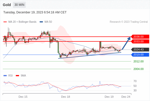 黄金价格(XAU/UD)在新一周的第一天重新获得积极的牵引力,并在欧洲市场保持温和的盘中涨幅,尽管缺乏后续买盘。美联储上周发出信号,表示其货币政策收紧周期结束,并预计在2024年累计降息75个基点。这反过来抑制了美元从上周五触及的四个多月低点的良好反弹,并成为大宗商品顺风的关键因素。除此之外,地缘政治风险和对