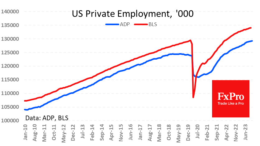 AD报告称,美国私营部门新增就业岗位10.3万个,低于一个月前预期的13万个和10.6万个(从11.3万个修正)。 该指标被视为官方数据发布前对就业市场的最后洞察。根据AD的数据,在过去的三个月里,私营部门平均每月创造10万个新工作岗位。我们在2018年底看到了类似的放缓,随后经历了一年的停滞,并在疫情爆发前逆转下降