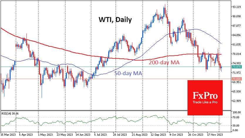 尽管OC+和美国政府官员在过去一周进行了口头干预,试图将平衡转向有利于赤字的方向,但油价仍面临压力,反映出对需求削减的担忧。 上周,OC+同意在明年第一季度的设定配额基础上每日减产220万桶。这比目前的产量减少了90万桶/天。 这一消息并没有帮助油价回到200天平均线之上,这是11月的阻力线。 本
