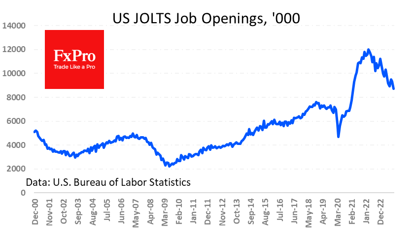在周五的就业报告发布之前,有更多迹象表明美国劳动力市场正在降温。10月份的职位空缺数量从9月的935万降至873.3万,预期为931万。 虽然偶尔有反弹,但这一数字比去年3月以来的1200万有所下降。然而,就业市场仍然比2019年1月的峰值750万人更加火热。 美国市场仍处于“坏即是好”的模式。这种逻辑对通胀来说