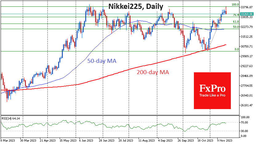 昨日日本市场有重大变动。日本股市开盘上涨超过1%,日经225指数达到33850点。这是自今年6月以来第二次短暂上升到这个高度,这种情况上一次出现是在33年前。触及高点引发了大幅抛售,该指数目前较开盘下跌0.6%,这可能是更大范围回调或长期回调的开始。 Fxro高级分析师AlxKutikvich指出:根据每日时间框架的技术