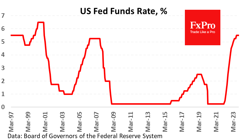 不出所料,美联储将关键利率维持在5.25-5.5%的区间,创22年新高。官方评论的语气和鲍威尔随后的新闻发布会让市场相信,进一步加息的可能性微乎其微,人们应该关注将利率维持在峰值的时机。 市场又一次把问题踢了回去,认为接下来的会议最有可能加息,但并不特指下次会议。FdWatch工具指出,12月13日加息的几率