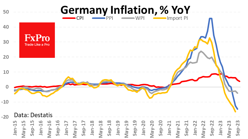 德国通胀的降温幅度超出预期。根据10月份的初步估计,房价同比涨幅降至3.8%,为两年多来的最低水平,远低于预期的4.0%。 经过协调(根据税收差异进行调整),德国现在的价格比一年前高出3%,势必会拉低整个欧元区的价格。 然而,价格压力来自几个方面,从经济萎缩到大宗商品价格下跌。德国经济环比萎缩0.1%,在过去