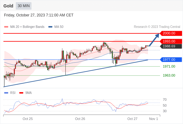 黄金价格(XAU/UD)在1990美元附近窄幅波动,因中东紧张局势升级缓解了下行压力,而上行空间受到更为乐观的美国经济数据的限制,即强劲的第三季度国内生产总值(GD)和耐用品订单。尽管核心个人消费支出(C)通胀数据公布,但贵金属未能表现出决定性的行动。 美国经济分析局(A)报告称,与8月份0.1%的增长相比,9月份