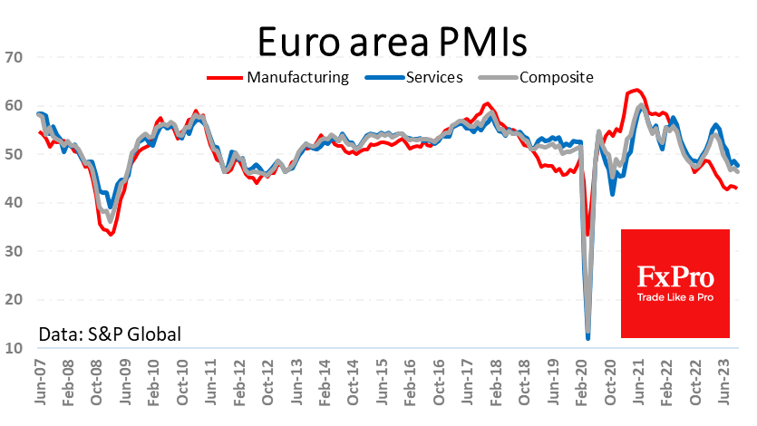 欧洲的经济活动正在降温,引发了德国和整个欧元区正在出现衰退的担忧。 事实证明,对于外汇和股票市场投资者来说,I指数是经济周期的可靠指标。10月份的最新初步估计令人失望,显示经济衰退加深,而不是预期中的好转。 最令人失望的是德国服务业指数,该指数从50.3降至48.0,重新回到收缩区间,无法保持增