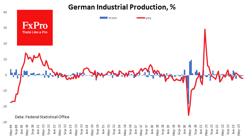 德国8月份工业生产连续第四个月收缩,低于预期。上个月的跌幅为0.2%,使同比跌幅达到2.0%。 2018年初,德国工业生产指数开始下降,这更容易与与中国爆发的贸易战联系在一起,而不是与过去4年交替发生的冠状病毒、昂贵的能源和高利率等危机联系在一起。 当天并没有大量有意义的数据发布,因此德国公布的