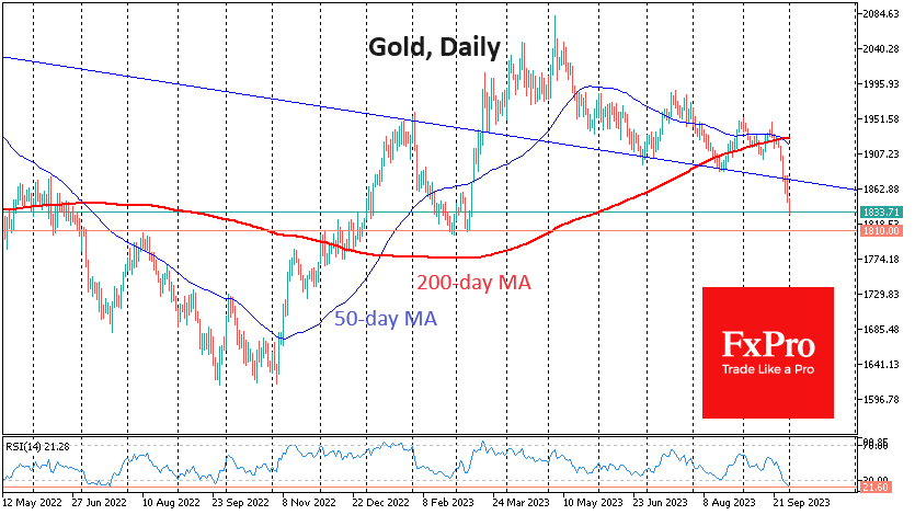 金价上周下跌近4%,创下两年多来的最大跌幅。每盎司金价跌破1835美元,为今年3月以来的最低水平。上周的黄金抛售看起来像是多头的投降,突破了几个月的支撑。这可能很快就会导致波动性上升,创下新低。市场拐点往往是在这样的时候形成的。 Fxro高级分析师AlxKutikvich指出:上周,金价突破了近几个月来下行通道