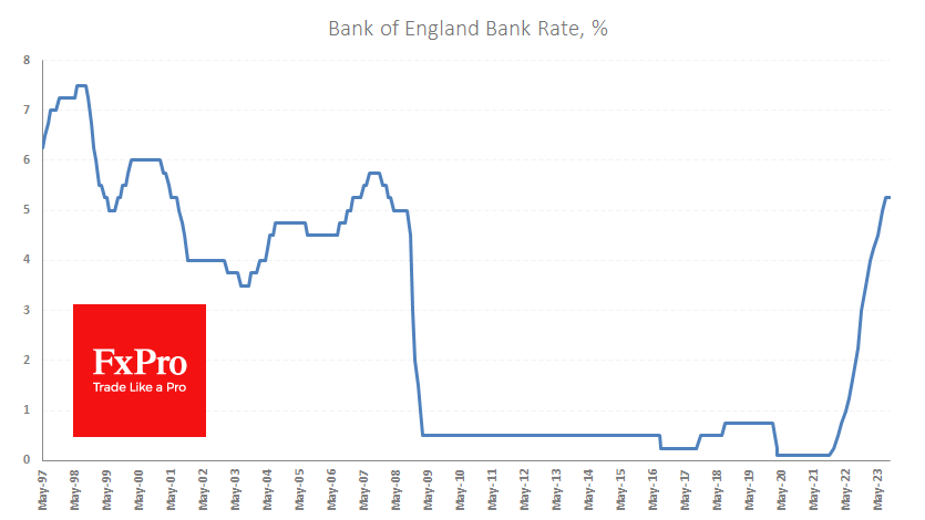 英格兰银行将其关键利率维持在5.25%不变。昨日英国发布通胀报告后,英镑报价积极反映了这种结果的可能性。 同期的汇评指出,英国央行(akofglad)的GD增长前景不断恶化,劳动力市场出现恶化迹象。此外,央行预计通胀将在近期显著放缓。 Fxro高级分析师AlxKutikvich指出:鉴于能源价格回升、生产者价