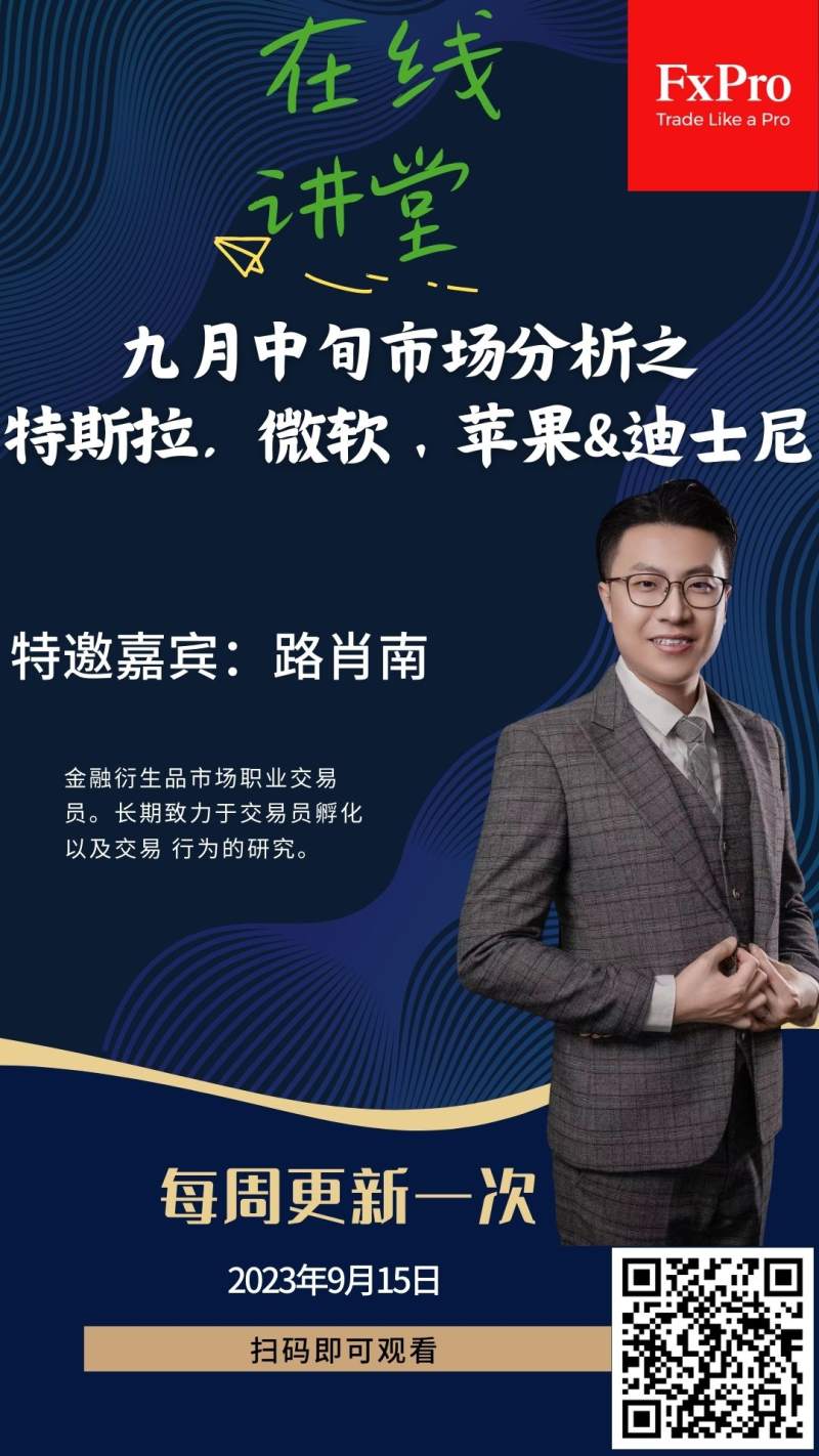 Fxro特邀嘉宾路肖南录播的九月中旬市场观察将分两期播放,本期为第一期,主要讲解特斯拉,微软、苹果a迪士尼美股行情,扫码即可观看。