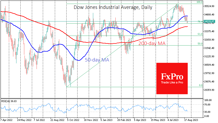 Fxro高级分析师AlxKutikvich指出,美国股市周四的表现非常明显,因为三大股指——标准普尔500指数(a500)、纳斯达克100指数(adaq-100)和道琼斯30指数(DowJo30)——证实了看跌趋势的主导地位。至少在中期是这样。 最受关注的美国股市指数在接近50日平均水平时遭遇大幅抛售。周四的下跌幅度比市场