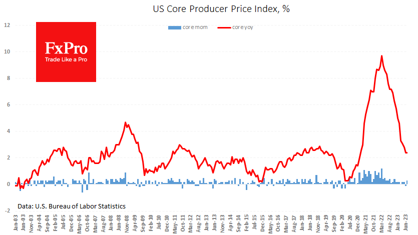 美国7月份生产者价格(包括和不包括食品和能源)环比上涨0.3%。这是第一个惊喜的指标——在此之前六个月,经常错过价格平均预测,支持快速缓解价格压力的期望。 Fxro高级分析师AlxKutikvich指出:总体指数的年化增长率从0.2%上升到0.8%。核心价格指数同比保持2.4%的涨幅。7月份价格上涨的主要驱动力是服务价格上涨,