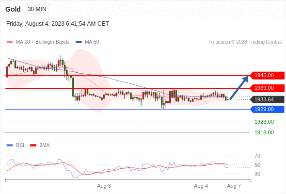 周一亚市早盘,关键的美国通胀公布金价未现意外,维持前一交易在关键支撑线附近的修正性反弹,这主要是受到美国就业数据好坏参半的支撑。在这期间,金价拉锯于1,943美元附近,截至记者发稿时已接近50-DA关口。 尽管经济数据好坏参半,且市场对美联储(FD)9月加息的担忧有所缓解,但美元指数(DXY)仍成功录得三周