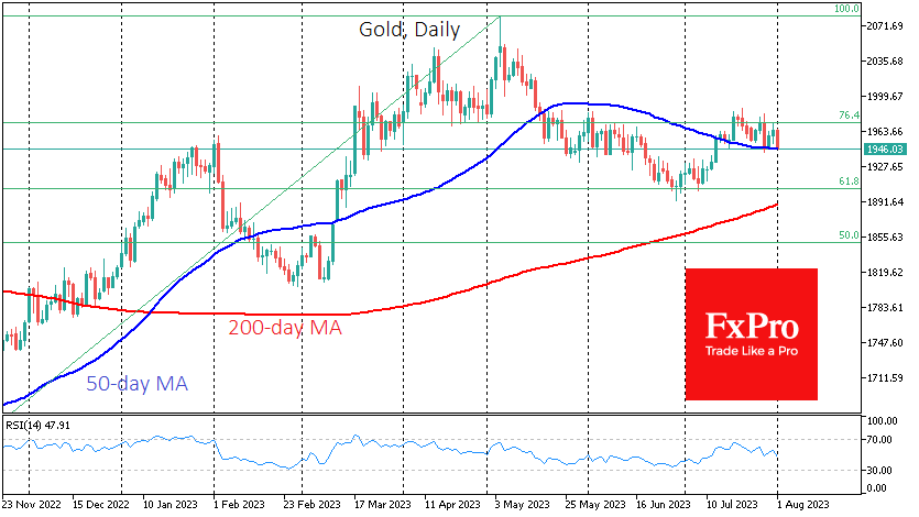 自7月13日以来,黄金一直坚守在50日移动均线的支撑位,但没有找到足够的力量突破它。上周四,随着美元走强,市场再次测试了这一上行趋势。周二早盘,金价下跌0.6%,跌至1953美元/盎司,仅比这条曲线高出6美元。 Fxro高级分析师AlxKutikvich指出:从技术上讲,能够保持在这条线上对多头来说将是一个重大的战