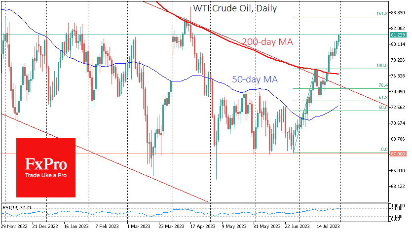 油价在过去一周加速上涨,比6月28日的低点上涨了20%以上,这是最近一次反弹的开始。技术因素开始发挥作用,强劲的宏观数据给市场带来的兴奋情绪正在火上浇油。 Fxro高级分析师AlxKutikvich指出:西德克萨斯中质油(WTI)周一突破每桶81美元,在六周的上涨后,目前正创下数月新高。上周一,金价从200日移动均线大幅