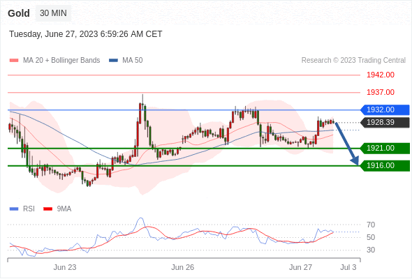 周二黄金价格下跌,中断周初1933美元和1910美元整数关之间的平衡。金价从1,930.73美元的高点跌至1,910.89美元的低点。基本上,后市几天关键事件发生之前,继周一窄幅波动后出现下跌。 5月美国耐用品订单意外上升,但前值得到下修。俄罗斯方面,该国短暂的兵变带来的风险似乎已经被消化,并被置于次要位置。与此同时,
