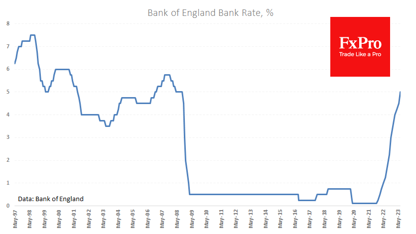 Fxro高级分析师AlxKutikvich指出:英格兰银行将其关键利率提高了50个基点至5.00%,这一举动比本周早些时候预测的分析师们所预期的更为剧烈。然而,考虑到前一天公布的最新通胀数据超出了市场预期和英国央行的预测,这是一个合乎逻辑的动作。考虑到英国持续的高通胀,我们本应预计英国央行会采取更强硬的立常