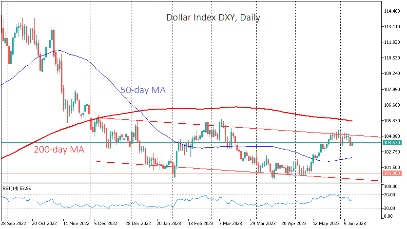 美元指数周四下跌约0.7%,短暂反弹至103.3下方。美元兑一篮子主要货币的涨势在上月底停滞不前,自6月初以来一直呈走低趋势。美元基本面看涨,而中期趋势的技术分析则倾向于下跌。 Fxro高级分析师AlxKutikvich指出:债务上限问题的解决迫使美国财政部重返债券市场进行配售。这些行动耗尽了金融体系的流动性,并通