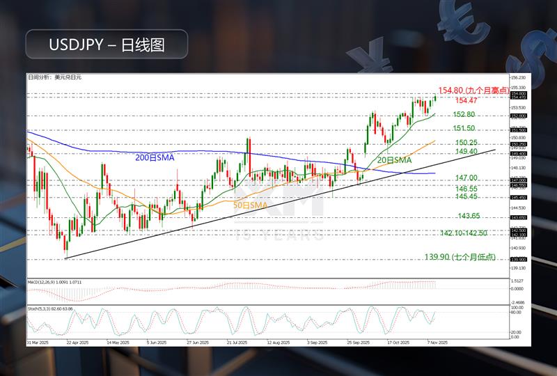 UDJY上涨至154.80附近 随机指标逼近超买区间 今日早盘,UDJY飙升至154.80附近,创九个月新高,因为市场预期日本当局短期内不会干预,以及美联储可能在下次政策会议上降息的猜测不断升温。 若上涨动能持续,该货币对将上看1月高点156.70,接着挑战158.86阻力位。