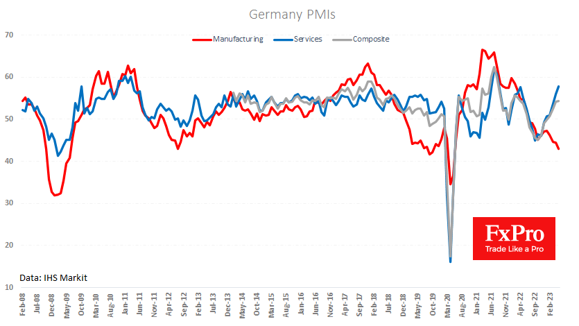 欧元区商业活动采购经理人指数的初步读数普遍显示出比预期更糟糕。根据综合指数,欧元区工业上一次遭受如此严重的损失是在2008至2009年,当时经济处于急剧下滑状态。 Fxro高级分析师AlxKutikvich指出: 自今年年初以来制造业活动的持续下降已经影响了服务业,在4月份达到年度高点之后,服务业可能已经出现从