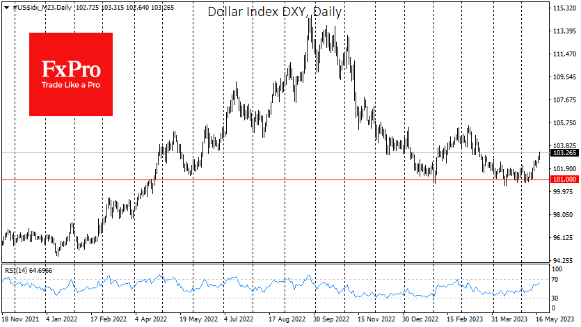 过去两周,美元兑主要竞争对手走强,兑一篮子主要货币上涨2%。美元指数超过103,这是自3月下半月以来的最高水平。 Fxro高级分析师AlxKutikvich指出: 值得注意的是,在美元走强的同时,股指也出现了反弹,这是一对奇怪的组合。美元正在上涨,下个月中旬有可能再次加息的可能性比较大。市场目前预计,美联储再