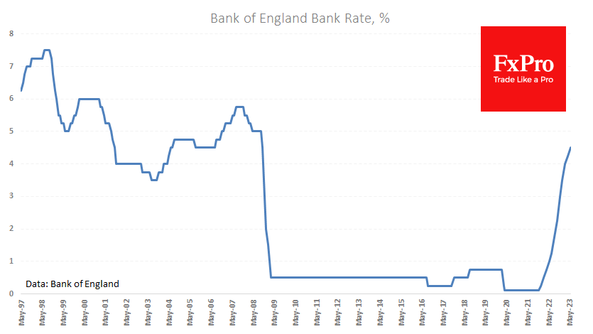 周四,英格兰银行将基准利率上调25个百分点至4.5%,标志着连续第12次收紧政策。在过去的四次会议上,九名成员中有两名在过去四次会议上投票决定维持利率不变。 Fxro高级分析师AlxKutikvich指出:相关评论为进一步加息和暂停加息敞开了大门。支持进一步收紧货币政策的理由是,英国通胀弹性更强,迫使英国央行定期