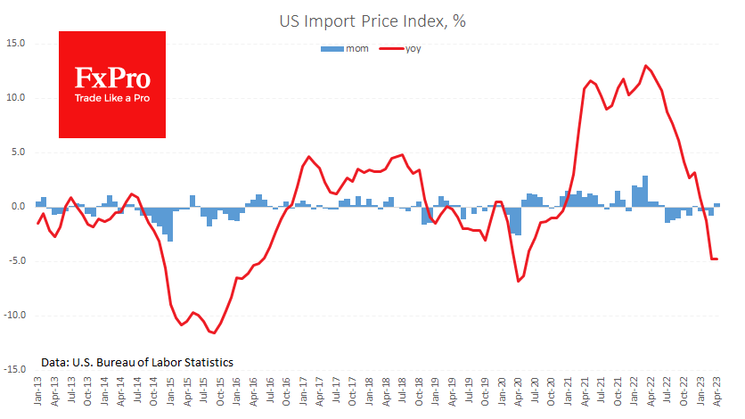 美国进口价格指数远好于预期,4月同比下降4.8%,预期为-6.3%。上个月该指数上涨了0.4%,为2022年5月以来的最大涨幅。 Fxro高级分析师AlxKutikvich指出:美国是一个巨大的进口国,因此该指数的发展将显著影响未来几个月的CI通胀。该指数的年增长率从去年4月开始大幅下降。I(生产价格指数)开始下降,CI(消费者