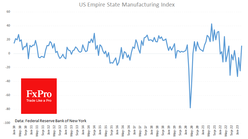 今天的经济数据并不多。最重要的是帝国州制造业指数(irtataufacturigidx),4月份的数据远高于预期。纽约联邦储备银行的指数从上个月的-24.6上升至10.8,尽管市场预期该指数将小幅上升至-17.7。指数高于0表示活动增加这是自去年7月以来的最高水平。 Fxro高级分析师AlxKutikvich指出:尽管这一指标近