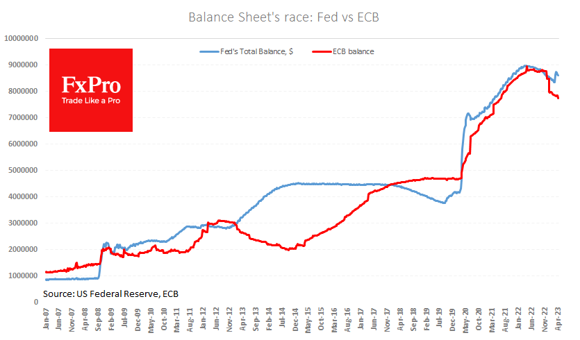 美联储上周资产负债表缩减176亿至86.15亿。资产负债表在三周内减少了1190亿美元,仍比3月初高出2750亿美元。 向金融体系注入流动性有助于支持对风险资产的需求,因为它减轻了金融体系的压力,并为银行业和市场创造更积极乐观的预期。 Fxro高级分析师AlxKutikvich指出: 从理论上来说,萎缩的资产负债表理