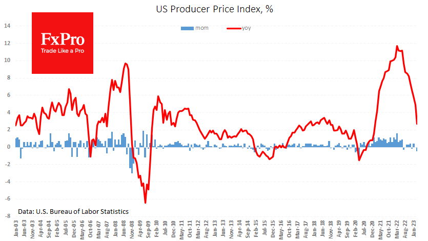 美国生产者价格是真正的通胀意外。在昨天生产者价格指数中的消费者通胀表现出温和的失望情绪后,市场出现了真正的震荡。继在3月份下降0.5%后,年增长率从4.9%下降到2.7%。这是自2021年1月以来的最低水平,但更重要的是,它接近过去20年来此类通胀的平均水平。 Fxro高级分析师AlxKutikvich指出:目前,市场