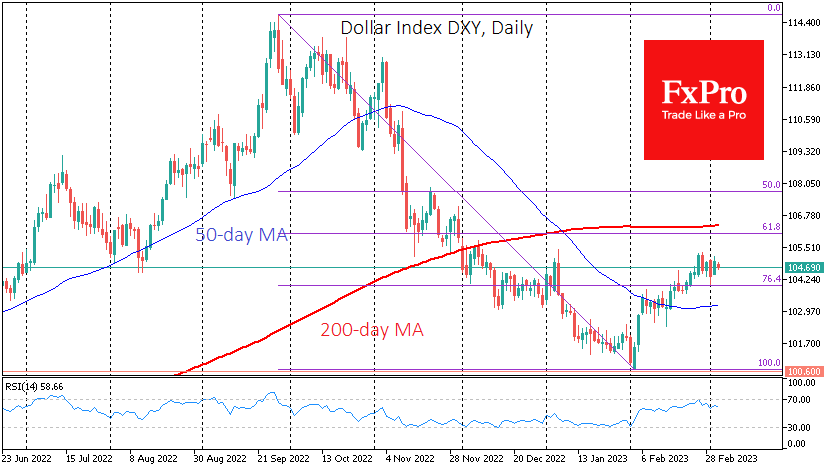 标准普尔500指数和纳斯达克100指数昨日盘中强劲反弹,吞噬了最初的跌幅,收盘走高。随着股市的反弹,美元指数正在形成向下行方向的逆转。 Fxro高级分析师AlxKutikvich指出:技术上,美元2月份的反弹已经清除了自去年9月下旬以来下跌过程中积累的超卖条件。日线上的RI触及超买区域,并在一周前被压低,为进一步