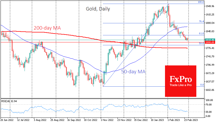 黄金继续测试底部,今天回落至1810美元以下。自2月初以来,走势显示上涨趋势出现了近乎完美的逆转,2日和3日的首次大幅回调之后是下跌趋势,几乎每天都在更新盘中低点。 Fxro高级分析师Alx?Kutikvich指出:直到上周中期,黄金的下跌符合典型的技术修正,但它现在的交易低于11月初1617美元到2日1960美元的高点的6
