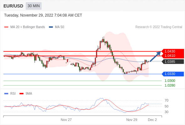 周三早盘,欧元/美元上涨,刷新盘中高位1.0340附近,同时结束三日下跌趋势。在这期间,欧元/美元温和上涨,截至发稿时,欧元/美元上涨0.15%,原因是期权市场发出了乐观的信号,以及在关键数据事件之前市场维持谨慎情绪。 其中,美联储主席鲍威尔11月美联储会议以来的首次公开亮相,以及欧元区11月消费者价格调和指数