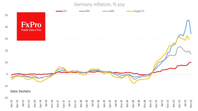 德国10月份生产者价格下跌4.2%;其同比增长率大幅放缓11.3个百分点。这是欧洲最大经济体一直在等待的通胀趋势的必要逆转。 Fxro高级分析师Alx?Kutikvich指出:与此同时,值得注意的是,通货膨胀已经攀升得太高了,在前两个月的生产者价格中,同比上涨了45.8%,监管机构正以极大的关注关注它在能源和食品之外的影