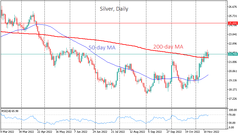 白银今天测试每盎司22美元关口,昨天短暂突破。尽管黄金标志着连续第五个交易日背靠背上涨,但白银可能在本轮市场周期中领先一步。 11月初,银价从50日移动均线上推高,50日移动均线在一周半之前一直是支撑位,盘中银价在50日移动均线下方被买断。 此外,当标准普尔500指数和股市总体上从美联储不那么鸽派的