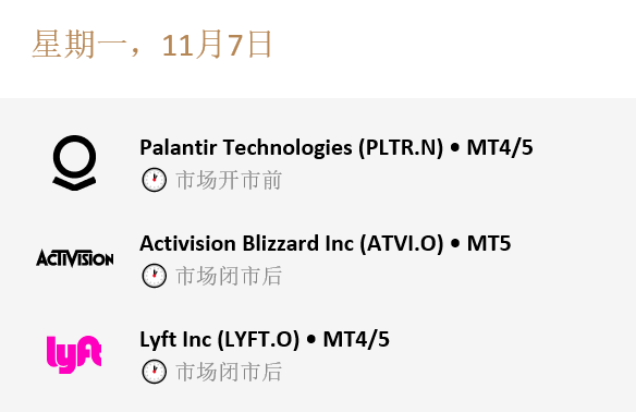 本周收益精选! 第三季度财报季已过了一半,我们重点列出了以下12个值得本周关注的股票! 我们在T5平台提供低点差与无手续费的2000+股票CFD差价合约产品,同时绝大多数的股票也可在T4与Fxro自有平台上交易。 请注意以上日期与预期时间可能会变动。 请注意市